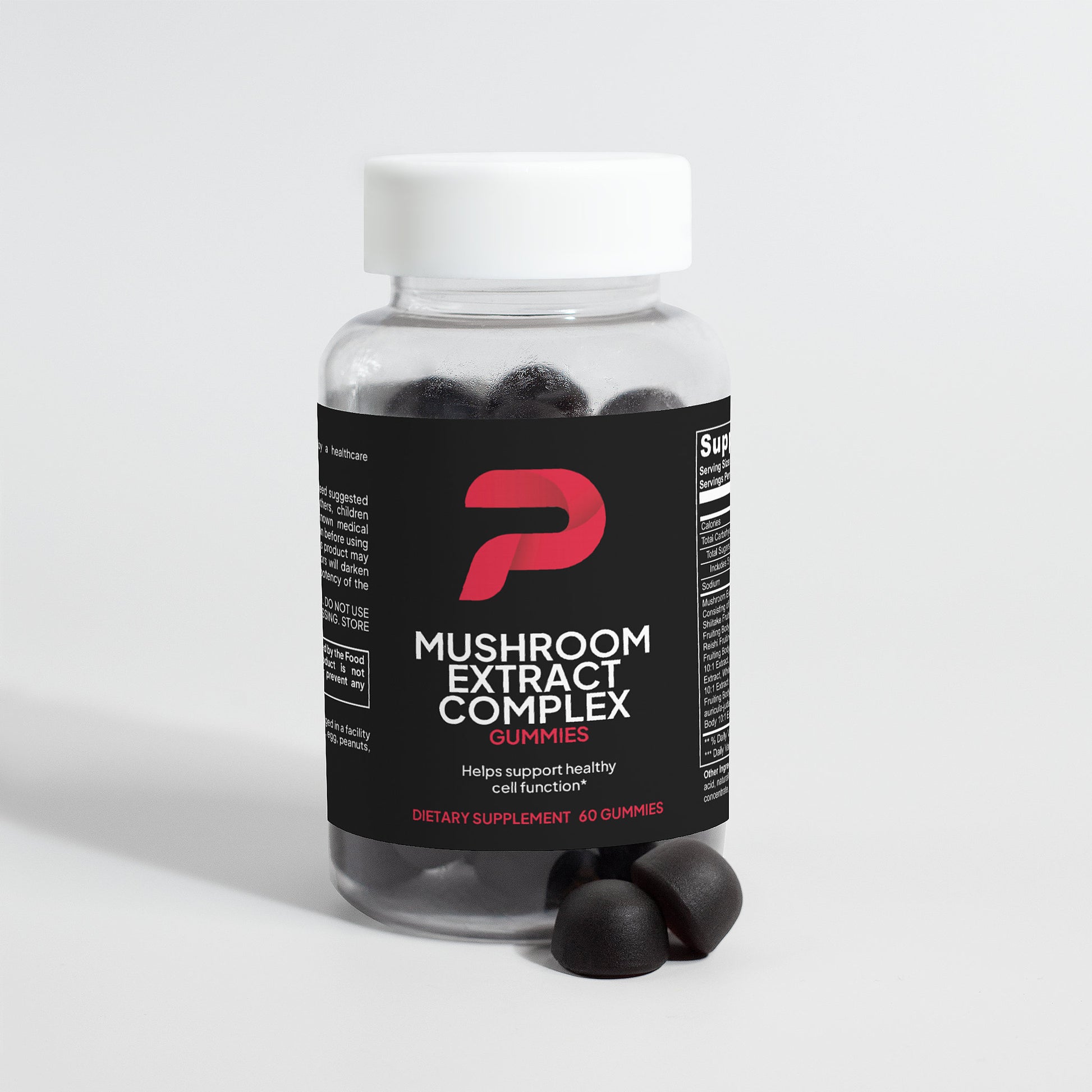 Ingredients: Mushroom extract (Maitake Fruiting Body 10:1 Extract, Shiitake Fruiting Body 10: 1 Extract, Lion’s Mane Fruiting Body 10:1 Extract, Reishi Fruiting Body 10:1 Extract, Cordyceps Fruiting Body 10:1 Extract, Chaga Fruiting Body 10:1 Extract, Turkey Tails Fruiting Body 10:1 Extract, White Button Mushroom Fruiting Body 10:1 Extract, Black Fungus Fruiting Body 10:1 Extract, Royal Sun Mushroom Fruiting Body 10:1 Extract), glucose syrup, sugar, dextrose, pectin, citric acid, natural raspberry flavor, sodium citrate, purple carrot juice concentrate, palm oil (contains carnauba wax).